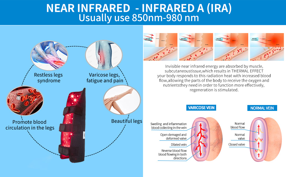 Effective wavelengths of near infrared light therapy include 750 nm to 1,400 nm. The wavelength of the near infrared is more beneficial in treating deep wounds and relieving muscle and joint pain. 850nm and 980 nm are common for near infrared light therapy.